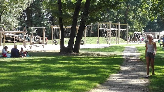 Fantastische ervaring: Wij zijn van Nazareth nabij Gent en nu op vakantie. Dit is een heel mooie speeltuin, goed onderhouden met veel speeltuigen. Het was 26 graden maar in de schaduw van de hoge bomen was het goed zitten.