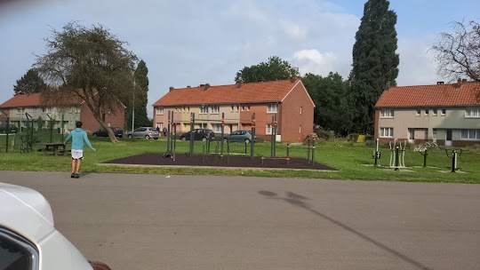Fantastische ervaring: Je ne savais pas à quoi m'attendre en arrivant. Je savais juste que c'était "une plaine de jeux grandeur adulte" . (J'ai voulu inscrire"plaine de jeux pour adultes" mais ça risquait de prêter à confusion ). Tout d'abord, c'est gratuit, pas besoin de réserver, pas de portail à passer, rien. Vous avez 5 minutes de temps libre, vous n'avez plus d'excuses pour ne pas faire de sport ! , Donc il s'agit de divers modules composé de barres horizontales et verticales de différentes hauteurs. Le tout vraiment bien ancré au sol! Rien ne bouge! !!!!! Sauf 2 ou 3 barres horizontales qui tournent sur elles-mêmes mais même pas d'un quart de tour. Donc elles bougent mais très très peu ! Le sol est en matière amortissante. Il y a également quelques appareils sportif (pédalier devant les bancs, des mouvements de skis de fond, ...) , Le tout entouré d'herbe. Il y a juste à côté une table avec des bancs style stations d'autoroutes (entière précisions le !) Il y a quelques mètres plus loin des goals. Le tout n'est pas clôturé. Même si les voitures ne roulent pas vites, .... Attention de vouloir aller chercher le ballon échappé en plein match, la rue longe le domaine. Juste à côté une énorme plaine bitumée, sans trous, sans réparations! Nickel Le parking est aisé J'avoue, je suis bluffé de la qualité des infrastructures! Bref de quoi ne pas s'ennuyer Seul petit bémol : il n'y a pas un réel coin d'ombre. Certes il y a bien deux ou trois arbres mais comme ceux ci ne sont pas des plus gros (ok ils vont grandir et le devenir, mais en attendant.....). Sinon et comme partout, l'incivilité de certains continueront à me faire bondir. Et pour info, une plaine de jeux pour petits enfants se trouve à 20 m de là. (Pas de possibilité de regarder son bambin jouer le temps de l'entraînement. Les deux espaces sont bien séparés)